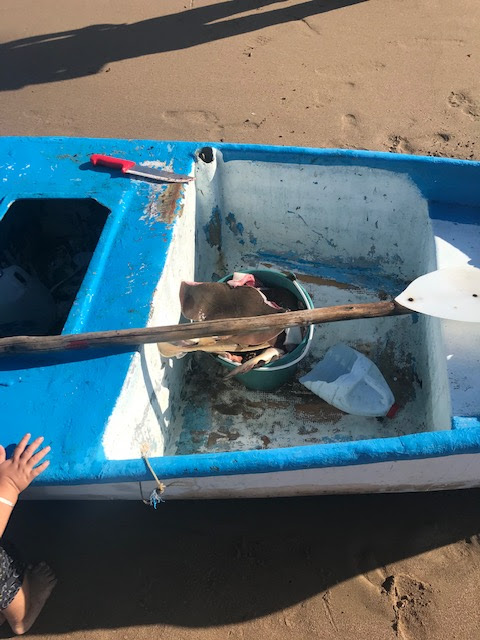 My morning generally consists of coffee at the palapa where I sit watching the action on the ocean. Today our young fishermen with the small boat had brought in the early morning catch to process on the beach right in front of our place. He seemed happy with his catch and away he went with it. Not sure if he was going to market or just taking them home. There was a little guy there as well who was quite interested in what was going on. Perhaps one day he will be a fisherman too.