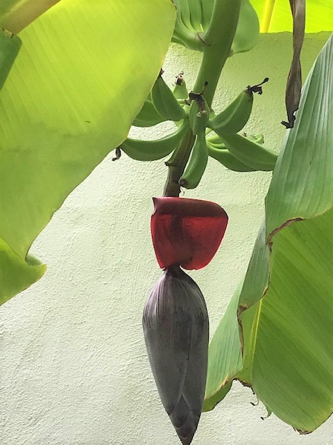 Our banana tree is still flowering in the back of the Ponderosa. The bulb on the bottom curls up one layer at a time and shows a nice flower. It lasts for about a day and then drops off and a new one curls up.