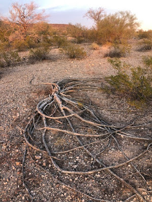 We had a nice morning Happy Hour going on when the Sheriff's department guy pulled up to check us out. The land we are parked on is native reserve and we needed a permit to be here. He told us that if we were staying here, we would have to pay $15 bucks for I don't know how long. I wasn't interested because I have wheels on my house, and I don't need to pay to park where people stay and poop in the bushes and leave all sorts of garbage around. This is one of the not so nice boondocking spots because of what I mentioned, but also because we have a railway mainline on one side of us and an interstate on the other side. It has been a place to be while we were doing things in Yuma, but we are done here so "yes officer, we will move on!!" It certainly wasn't a picturesque place so no harm, no foul!! This was our spot in a wash.
