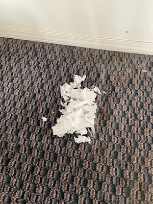 The golf course does a good job of rodent control, however one little varmint tried to make a nest in the fall. When we moved a cupboard this is what we found. No sign that he lived there though.
