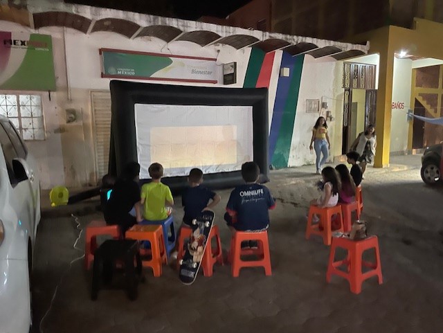 One thing we did this year was to bring down our blow up movie screen and projector for Kenia. She wants to do movie nights at the Cafecito. So tonight was the night to set it up. There were a few kids came and watched Rio. Our projector is a small one so it is not very bright especially where there is other light to compete. They liked it anyway so I think it was a hit.